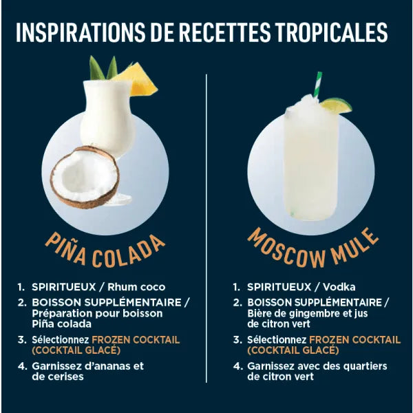 - 5 préréglages : granité, cocktail glacé, frappé, milkshake et jus glacé